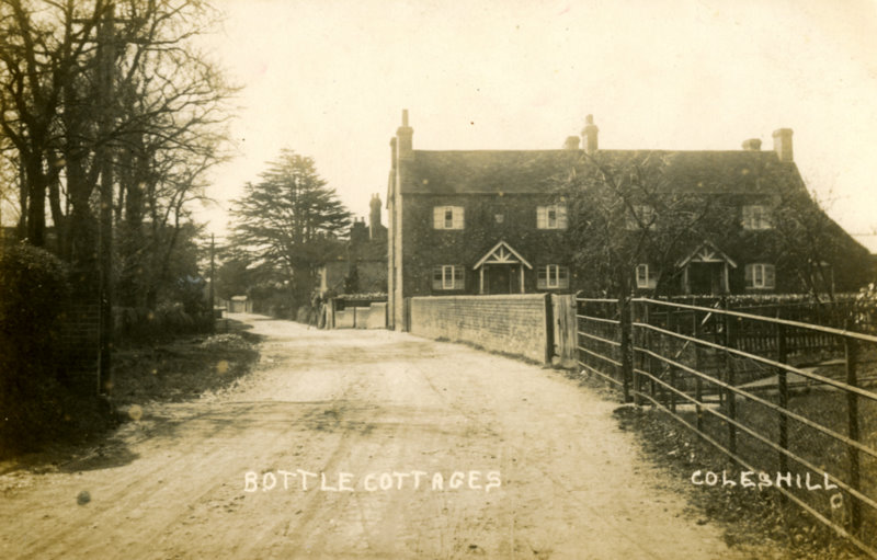 Now a single residence known as Coleshill Cottage, Bottle Cottages were until recently four cottages arranged two-by-two as a 'back-to-back'. The southeast unit is older than the others, having curved wind-braces, queen struts and clasped purlins, and is certainly seventeenth century. The interior has been so much altered that the original layout is not recoverable.