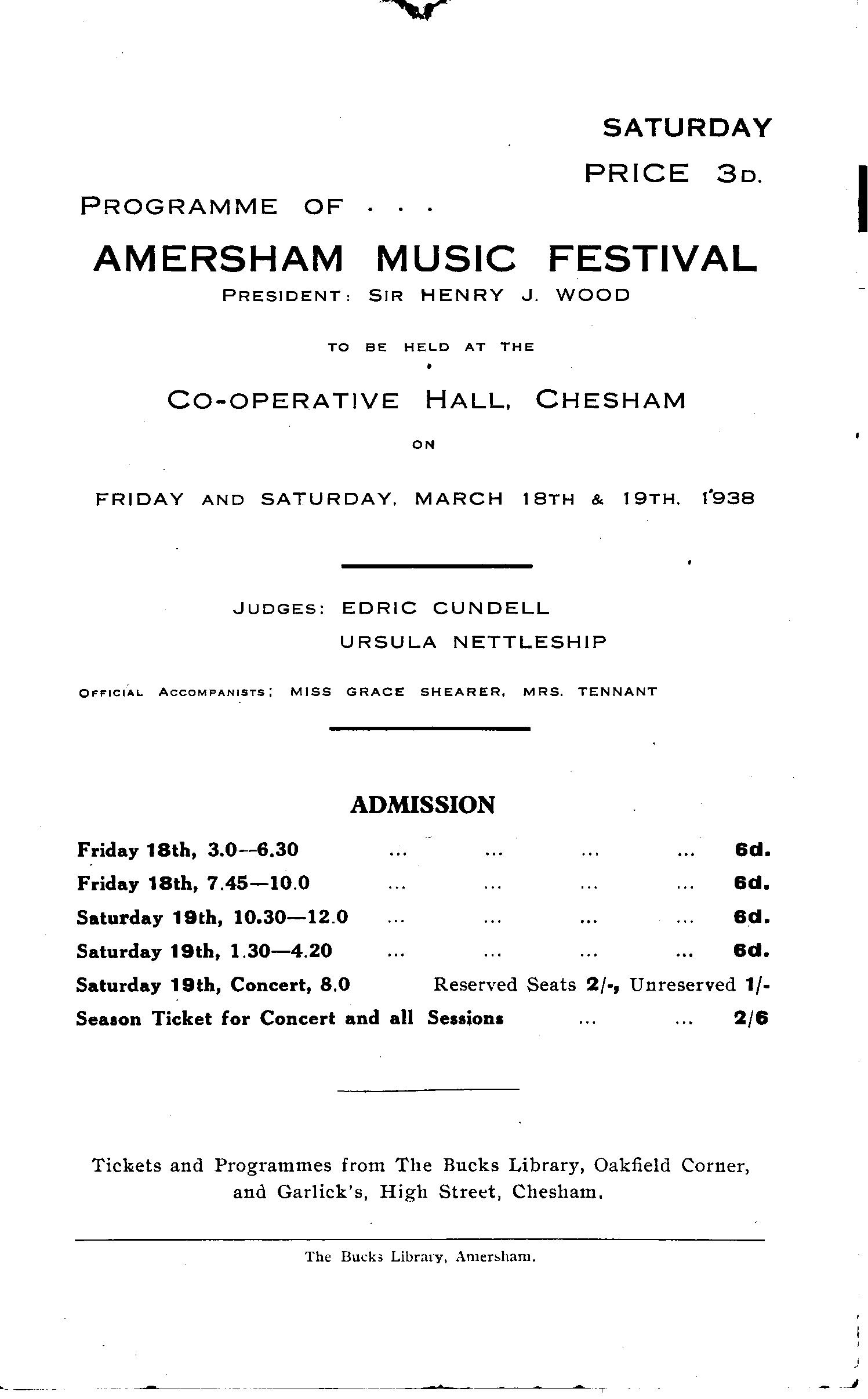 This programme for the Amersham Music Festival 1938 was provided by Chris Wege's sister. The Coleshill Choral Society played a role in the festival and also the name Stubbings is in the programme. It gives a little insight into the life of the village at that time. NB the eminent President!